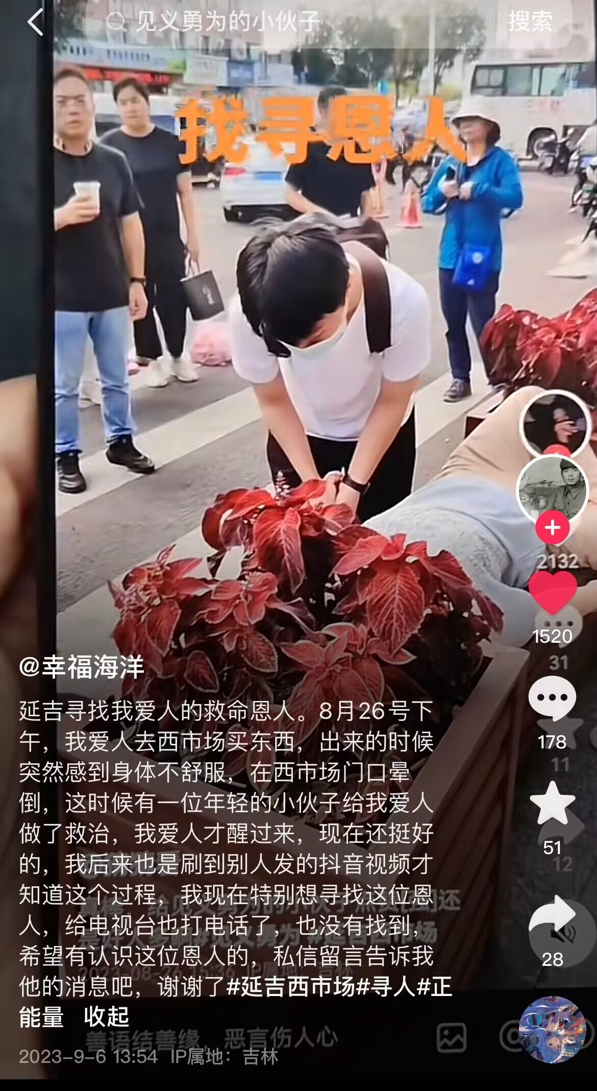 일전, 연길 시민들사이에서 사람을 찾는 동영상이 널리 퍼졌다. 영상을 보면 몇몇 행인들이 길가에 쓰러진 로인을 구조하고 있는데 그 중 한 젊은이의 치료 방법은 매우 전문적이고 구조 성공에 핵심적인 역할을 했다. 이 영상을 접한 피구조자 가족은 인터넷을 통해 생명의 은인을 찾아달라고 도움을 요청했다.