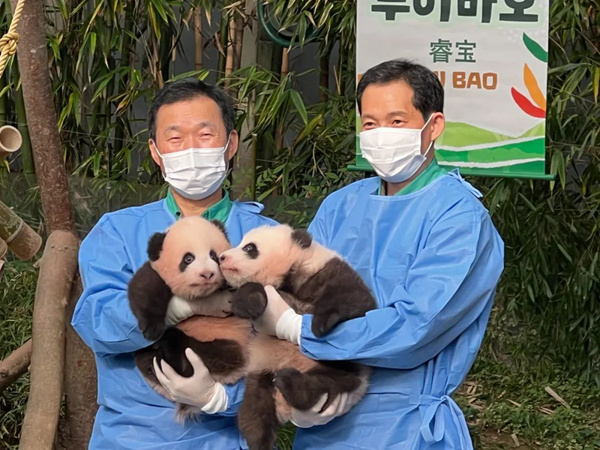 7월 7일 태여난 한국에서 살고 있는 ‘아이바오’와 ‘러바오’의 쌍둥이 아기가 백일을 맞이했는데 한국 에버랜드 참대곰관은 현지시간 10월 12일 쌍둥이 아기들의 첫 대중들과의 만남을 통해 그들의 이름을 공개했다. 두차례 온라인 이름공모활동을 거쳐 쌍둥이 아기의 이름은 ‘루이바오’와 ‘후이바오’로 결정되였다.