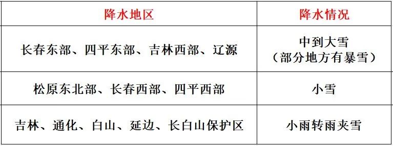 길림성은 흐리겠고 백성 동부, 송원, 장춘, 사평, 료원에는 큰눈에서 폭설이 내리겠으며 부분적 지역에는 대폭설이 내리겠고 백성 서부에는 적은 눈에서 중등 정도의 눈이 내리겠으며 기타 지역에는 진눈까비가 내리다가 적은 눈에서 중등 정도의 눈이 내릴 것으로 예상된다.
