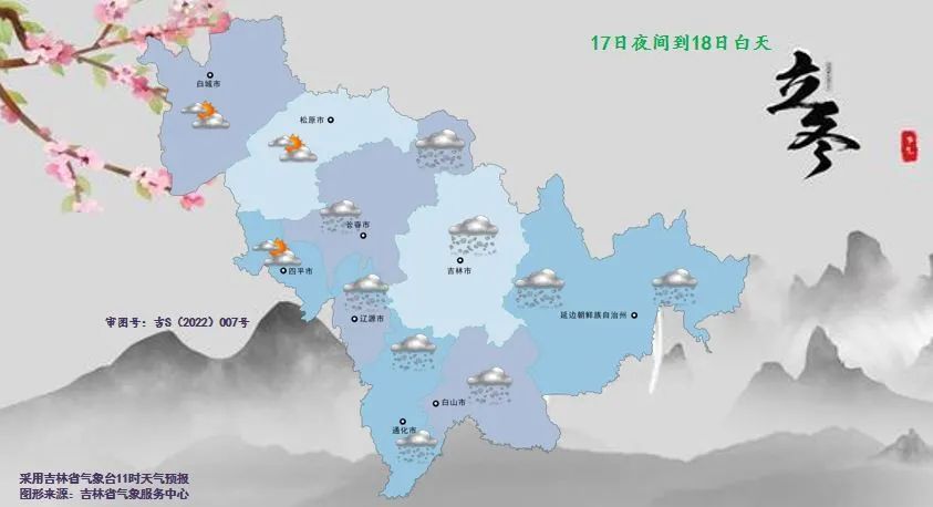 17일 밤부터 18일 낮까지, 길림성은 구름이 많고 이따금 흐리겠으며 장춘 북부, 길림, 통화 북부, 백산, 연변 서부, 장백산보호구에는 큰 눈 또는 폭설, 장춘 남부, 사평 동부, 료원, 통화 남부, 연변 동부에는 적은 눈 또는 중등정도의 눈이 내릴 것으로 예상된다.