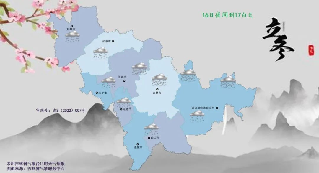 16일 오후, 길림성은 구름이 많고 이따금 흐리겠으며 길림, 통화, 백산, 연변 서부, 장백산보호구에는 진눈까비가 내리다가 적은 눈 또는 중등정도의 눈이 내리겠고 부분적 지역에는 큰 눈이 내릴 것으로 보인다. 백성 동부, 송원 북부, 장춘, 사평 동부, 료원에는 진눈까비 또는 적은 눈이 내리겠으며 연변 동부에는 적은 비 또는 진눈까비가 내릴 것으로 예상된다.