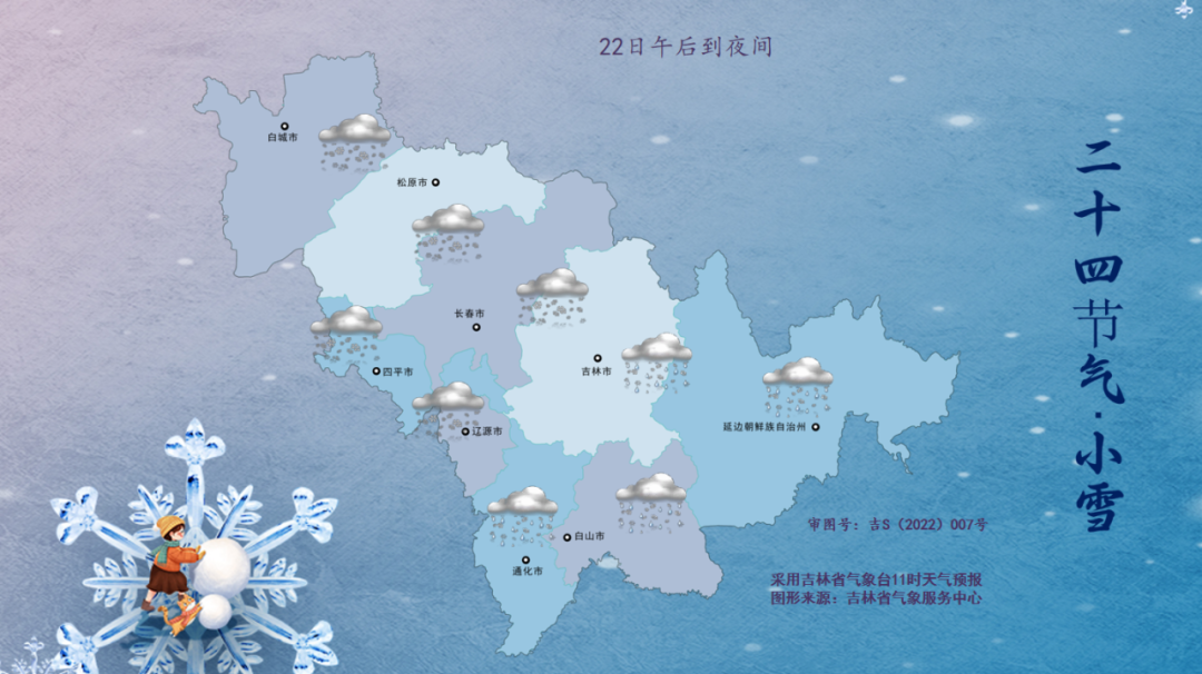 오늘(22일) 오후부터 밤까지 길림성은 구름이 많이 끼다가 이따금 흐리겠으며 백성, 송원, 사평 서부에는 적은 눈에서 중등 정도의 눈이 내리겠고 부분적 지역에는 큰 눈이 내리겠으며 장춘, 사평 동부, 료원, 길림 서부에는 적은 비 혹은 진눈까비가 내리다가 적은 눈에서 중등 정도의 눈이 내리겠고 기타 지역에는 적은 비 혹은 진눈까비가 내릴 것으로 보인다