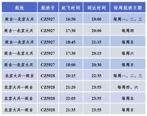 이번 직행 항공편은 12월 4일-12월 31일까지 매일 한차례 운항되며 CZ5927편 항공편이 연길-북경 대흥을 직행하고 CZ5928편 항공편이 북경 대흥-연길을 직행하게 된다. 구체적인 항공편 시간은 아래와 같다.