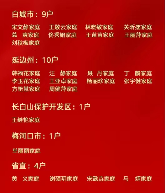 그중 연변에서는 리옥화 가정 등 10가구가 길림성 '가장 아름다운 가정'에 이름을 올리고 한복화 가정이 길림성 '가장 아름다운 가정 기준병'에 이름을 올렸다.
