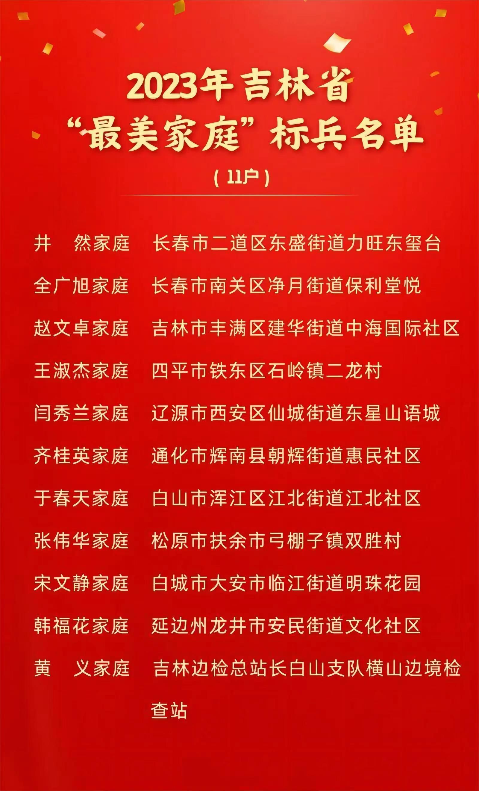 선진전형의 감동적인 사적을 광범위하게 선전하고 본보기의 힘으로 광범한 가정이 가정문명창건활동에 참여하도록 인솔하고 격려하며 나아가 사회주의 문명의 새로운 기풍을 형성하도록 추동하기 위하여 일전, 길림성 부련회, 문명판공실에서는 2023년 길림성 '가장 아름다운 가정' 100개, 길림성 '가장 아름다운 가정 기준병' 11가구를 선정했다.