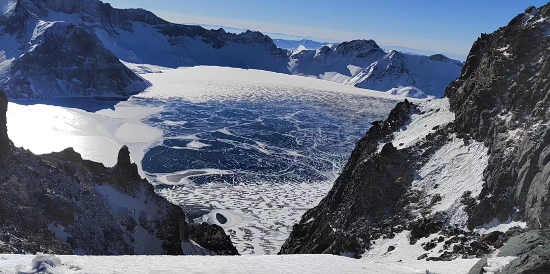 장백산 천지가 얼어붙었다. 12월 3일, 겨울해빛이 장백산 천지의 주봉에 비쳐진 가운데 백설로 뒤덮인 산봉우리와 서로 어우러져 원래는 푸르른 옥처럼 맑았던 천지물이 완전히 얼어붙었고 얼음면에는 찬란한 해빛이 반사되였다.