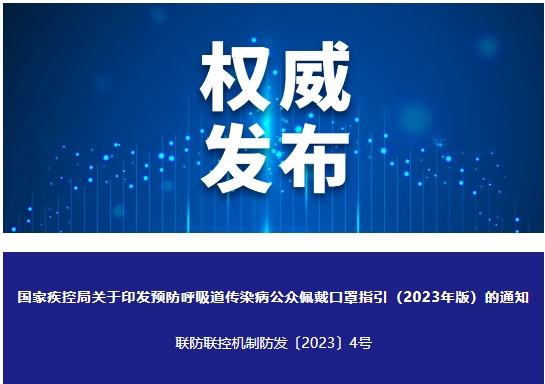 국가질병예병통제국 위챗 공식계정에 따르면 신종코로나바이러스감염, 독감 등 여러가지 호흡기 전염병의 예방통제사업을 더욱 잘하고 대중들이 과학적으로 마스크를 착용하도록 하기 위해 국무원 련합예방통제기제 전염병예방통제소조는 <호흡기 전염병 대중 마스크 착용 지침(2023년판)>(이하 <지침>으로 략칭)을 제정했다.