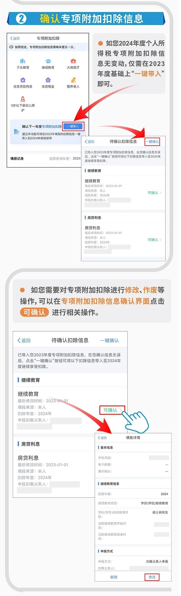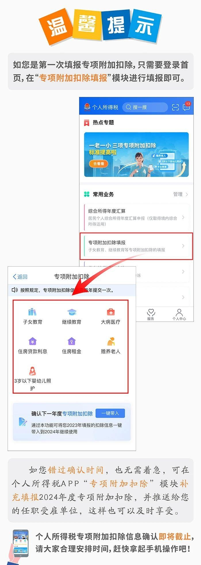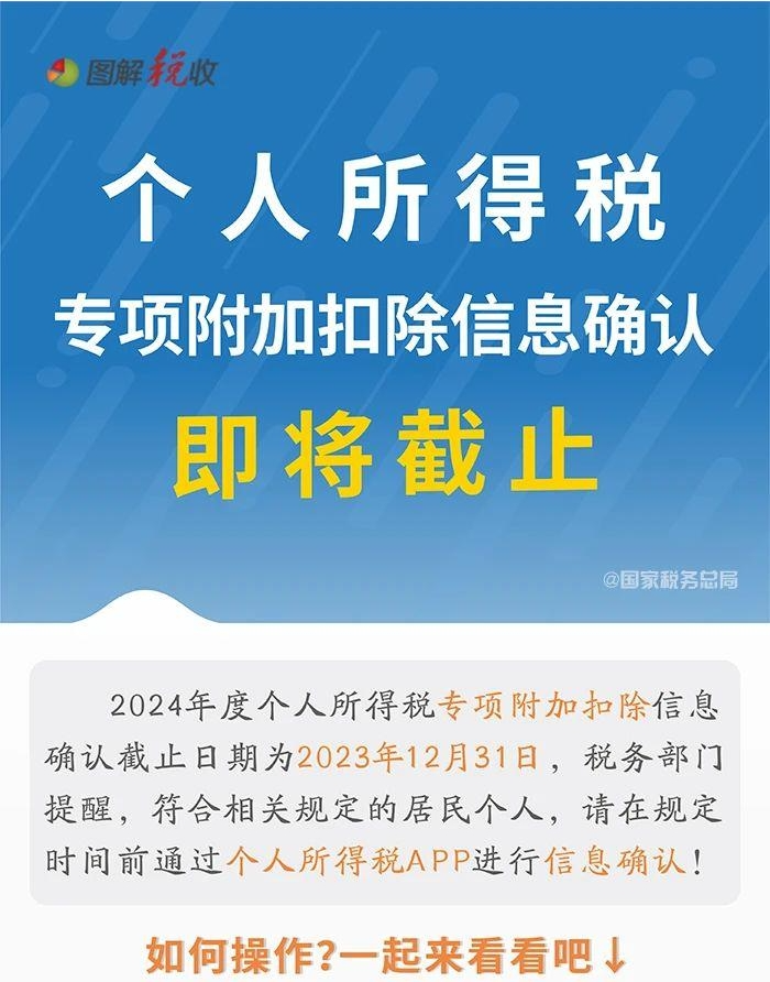2024년도 개인소득세 전문부가공제 정보확인이 2023년 12월 31일에 마감한다. 세무부문에서는 관련 규정에 부합되는 주민은 규정된 시간내에 개인소득세앱을 통해 정보확인할 것을 제시했다. 어떻게 조작하는지 아래 함께 보도록 하자.