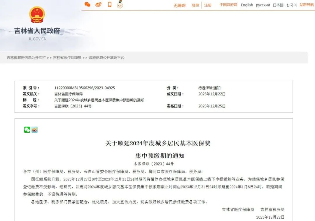 징수시스템 승격으로 2023년 12월 27일 0시부터 2023년 12월 31일 24시까지 도시향진주민 기본의료보험 온라인오프라인 신고예납 등 업무를 잠정 중단합니다. 도시향진 주민들의 의료보험 가입 등기 납부에 영향을 주지 않기 위해 2024년도 도시향진주민 기본의료보험 집중 예납기 마감시간을 2023년 12월 31일 24시에서 2024년 1월 6일 24시로 순연합니다. 이 기간 보험에 가입하거나 납부하는 경우 대우대기기한을 설치하지 않습니다.