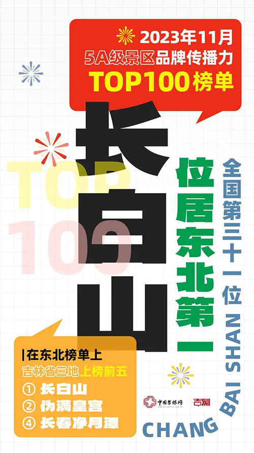 최근 만점연구원에서 발부한 2023년 11월 5A급 명승지 브랜드전파력 100강 순위에서 장백산이 동북 1위에 이름을 올렸다.