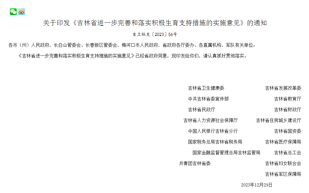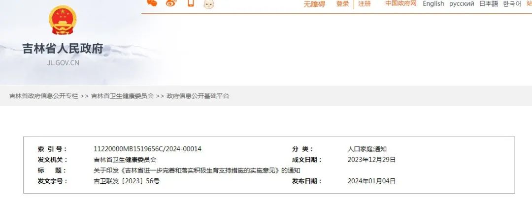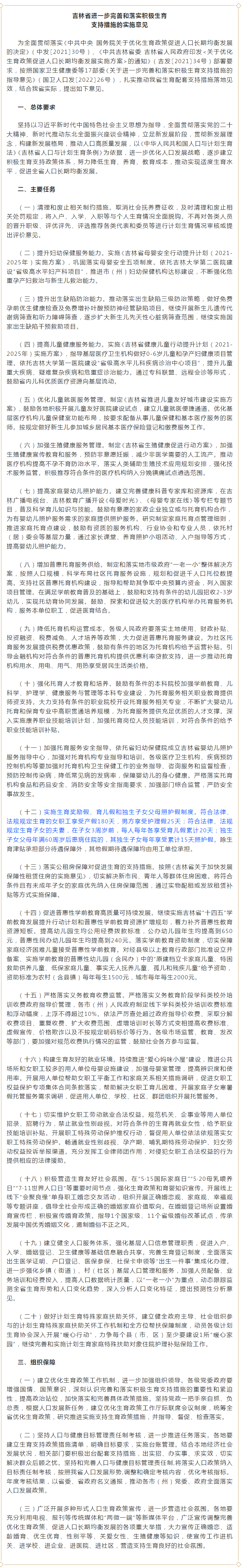 1월 4일 길림성인민정부 사이트는 "적극적 출산 지지 조치를 진일보 보완 및 시달할 데 관한 길림성 실시의견"을 인쇄발부할 데 관한 통지를 발부했다.