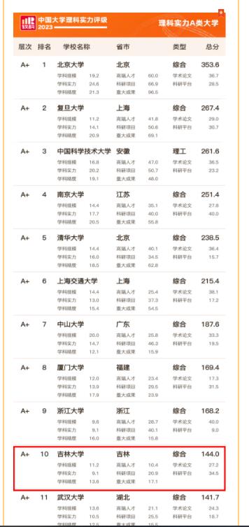 ranking의 2023년 ‘중국대학 리과실력평가'에는 학과 규모, 학과 실력, 학과 정확도, 고급 인재, 과학연구프로젝트, 중대 성과, 학술 론문 및 과학연구플랫폼의 8개 차원과 17가지 지표가 포함된다. 길림대학은 종합점수 144점으로 10위에 올랐으며 동북 모든 대학중 1위를 차지했다.