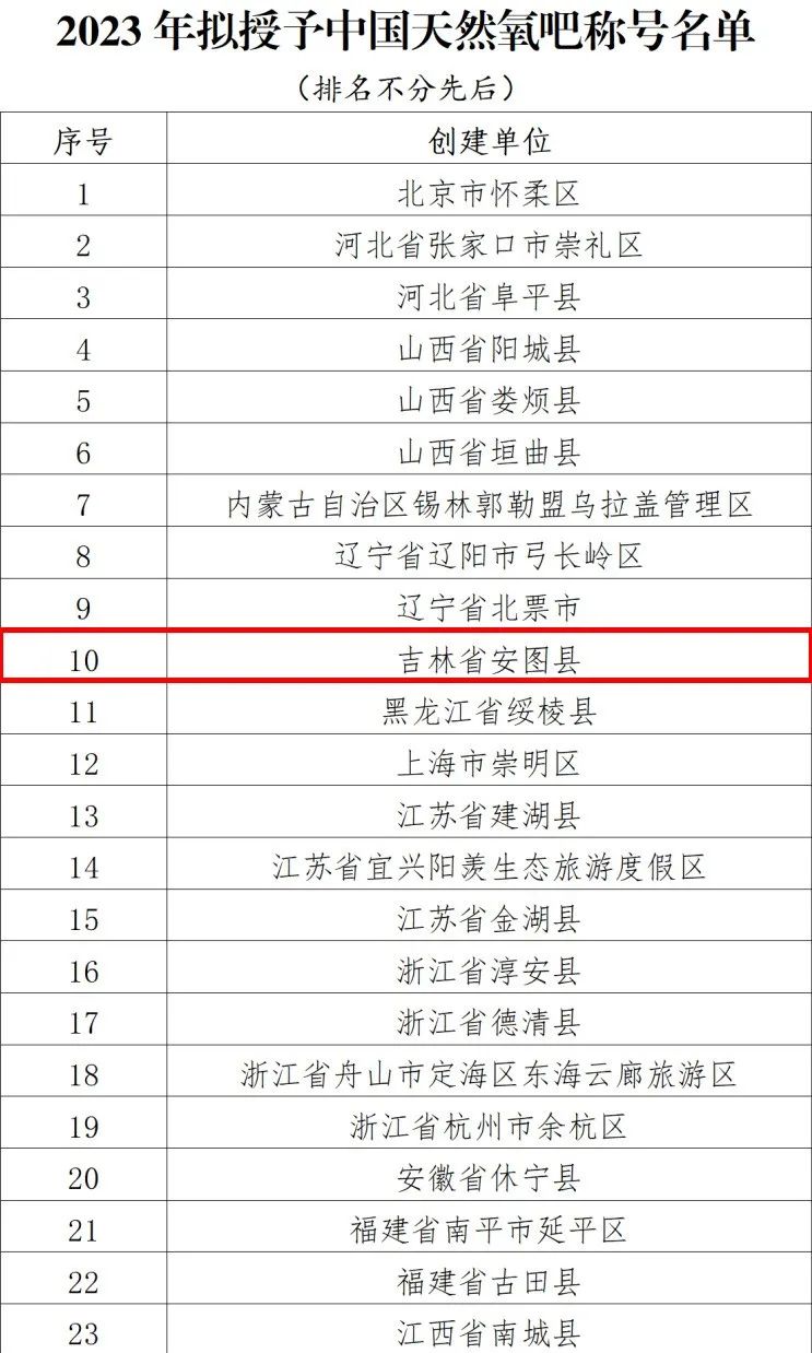 1월 11일 중국기상국 사이트에서는 2023년 중국천연산소바 평심 결과에 대해 공시를 진행했다. 엄격한 평심을 거쳐 북경시 회유구 등 66시 지역이 중국천연산소바 칭호를 수여받을 예정인데 공시기간은 1월 11일부터 15일까지이다. 길림성 안도현이 순위에 들었다.