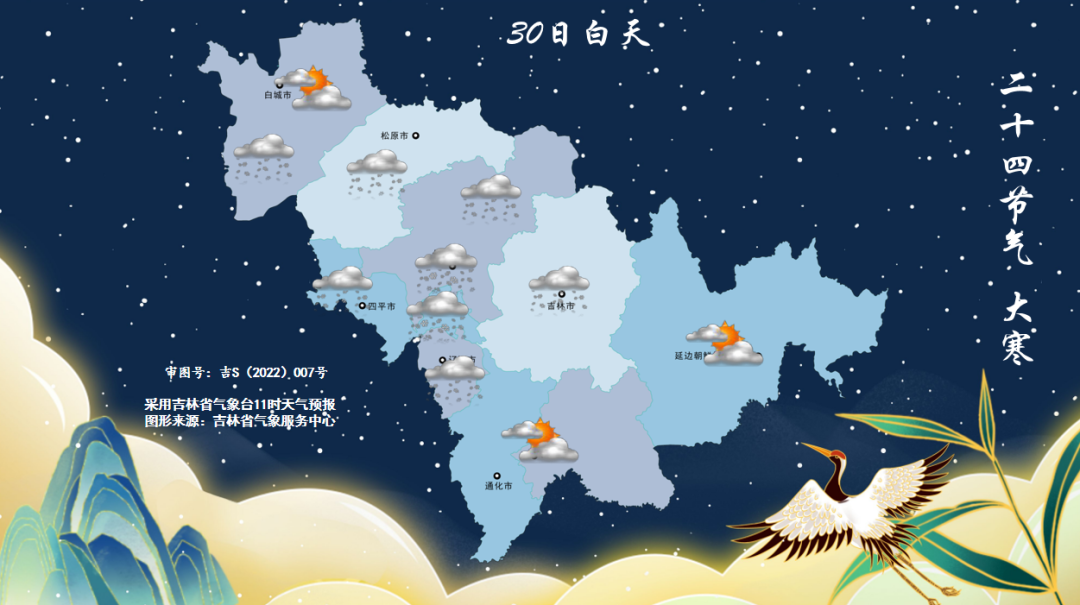 30일-31일 장춘, 사평, 료원, 길림, 통화 북부에는 중등 정도의 눈에서 큰 눈이 내리겠고 기타 지역에는 적은 눈에서 중등 정도의 눈이 내릴 것으로 예상된다.