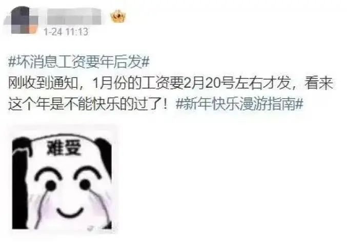 음력설 련휴와 함께 곧 로임도 받게 된다. 하지만 이틀전 한 네티즌은 설을 쇠고 난 후에야 1월 월급을 받을 수 있다는 통지를 받았다고 글을 올렸다.