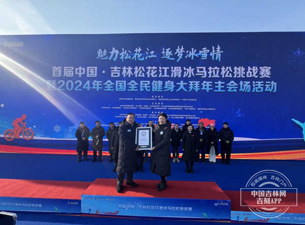 1월 30일, 중국 기네스인증관 오효횽녀사가 제1회 중국•길림 송화강 스케이팅 마라손 챌린지 및 2024년 전국전민건강 세배본대회장행사에서 이번 스케이팅 마라손 챌린지가 최대 스케이팅 시리즈 기네스세계기록 타이틀을 차지했다고 선포했다.