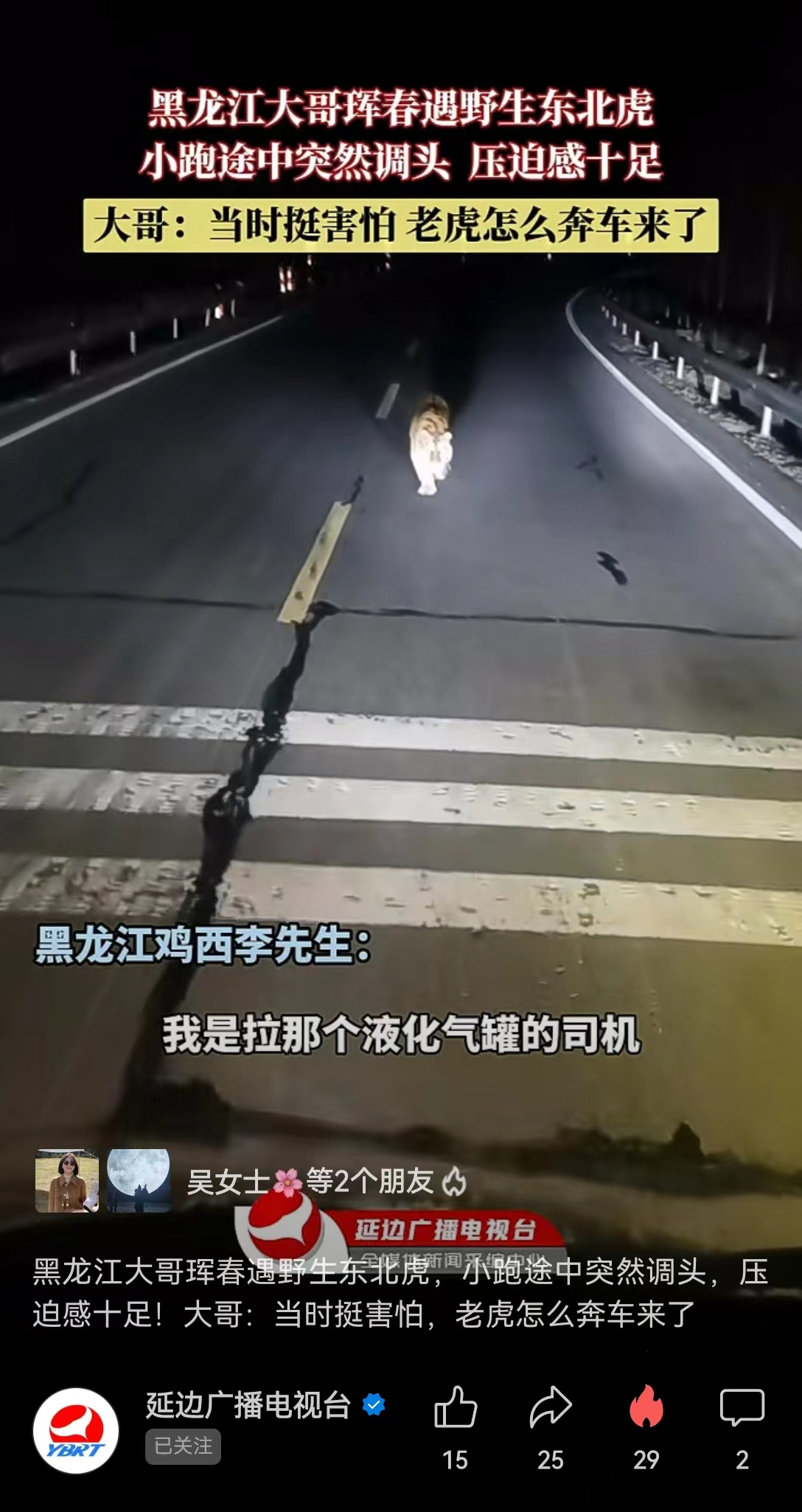2월 2일 저녁 10시반경, 흑룡강 계서 주민 리선생은 훈춘 춘화진에서 운전시 도로에서 야생동북호랑이 한마리를 발견했다.