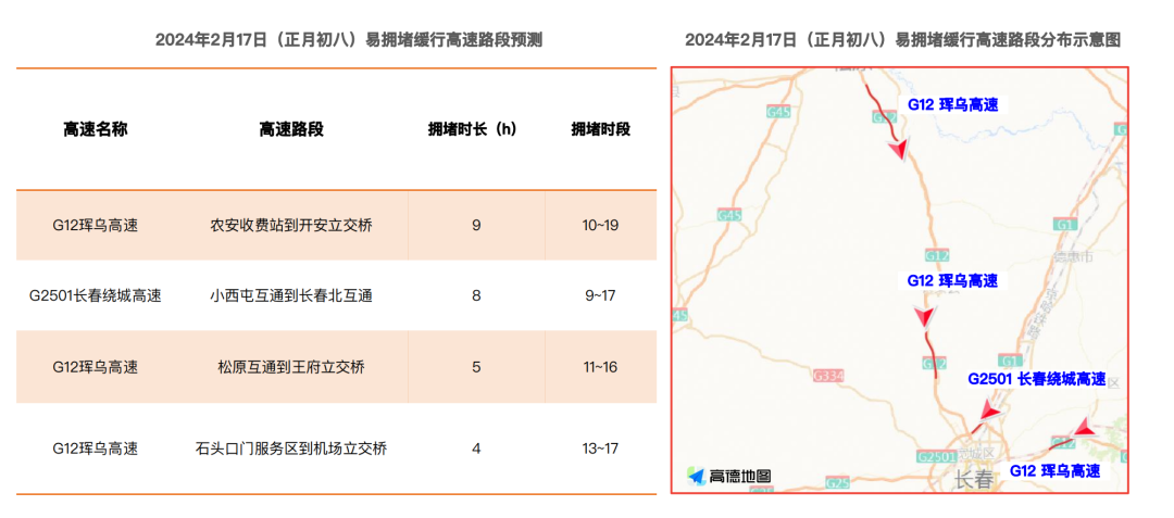 음력설 길림 귀성 고봉은 2월 17일(정월 초여드레)이고 고속도로 체증 도로구간은 주로 G12 훈춘-울란호트 고속도로, G2501 장춘 환성고속도로 등으로 예상되므로 이하 도로구간에서 운행하는 차주들은 시시각각 도로상황에 주의 돌리고 제때에 교통체증을 피할 것을 건의한다.