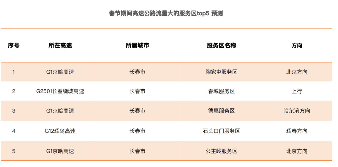 음력설기간 길림성 차량 흐름이 비교적 많은 휴계소는 주로 G1 북경-할빈 고속도로 장춘구간 도가툰휴계소(북경방향), G2501 장춘환성고속도로 상행춘성휴계소, G1 북경-할빈 고속도로 장춘구간 덕혜휴계소(할빈방향), G12 훈춘-울란호트 고속도로 장춘구간 석두문휴계소(훈춘-울란호트 방향), G1 북경-할빈 고속도로 장춘구간 공주령휴계소(북경방향) 등이다.