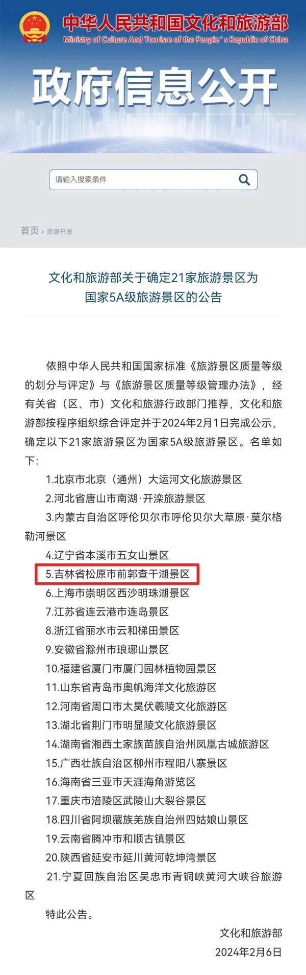 문화관광부는 2월 6일 공고를 발표하여 북경(통주)대운하문화관광풍경구 등 21곳의 관광풍경구를 국가 5A급 관광풍경구로 확정했다.