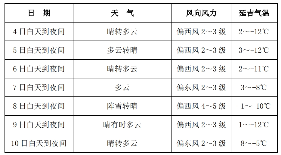 기상부문에 따르면 이번 주(3월 4일-10일) 연변의 총체적 날씨 추세는 기온이 다소 낮고 강수가 뚜렷이 적을 것으로 보인다. 전 주 평균기온은 -5.0℃ 안팎으로 평년 동기보다 1.2℃ 가량 낮고 4일-7일 기온은 비교적 안정적이겠으며 낮 최고기온은 일반적으로 0℃~4℃겠고 찬공기 영향으로 8일-9일 기온은 다소 하락되였다가 10일부터 기온은 뚜렷이 상승될 것으로 보인다. 전 주 평균강수량은 0.5밀리메터 미만으로 평년 동기보다 3밀리메터 가량 적을 것으로 보인다. 8일 분산식 소낙눈이 내릴 것으로 예상된다.
