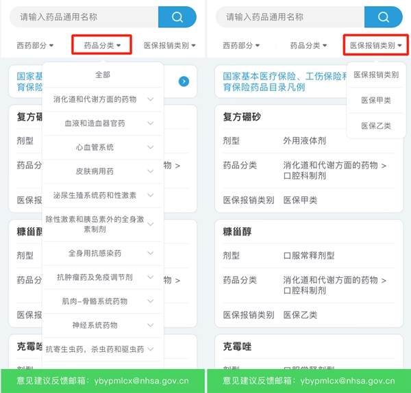 자신의 수요에 근거하여 ‘약품분류’ 혹은 ‘의료보장 취급종류’를 선택하여 선별할 수 있다.