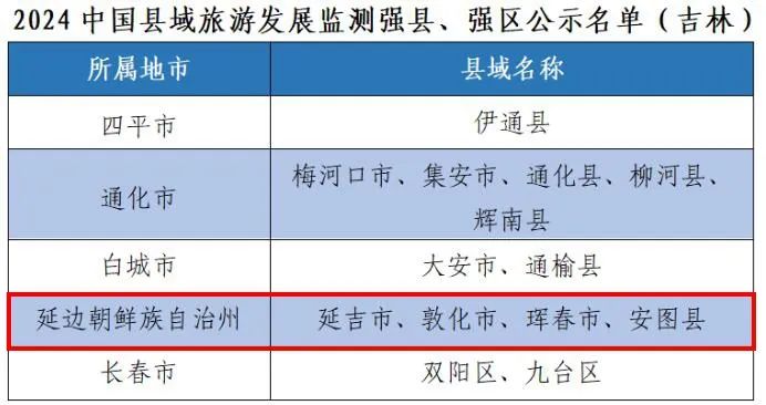 2023년 말까지 길림성에는 60개의 현급 행정단위(직할시 포함)가 있다. 그중 직할시 21개, 현급시 20개, 현 16개 , 자치현 3개이다. 길림성은 2024(제7회) 중국현역관광발전감측에 편입된 강현은 12개, 구역은 2개로 길림성 현급 단위 총수의 23%를 차지한다. 공시는 다음과 같다.