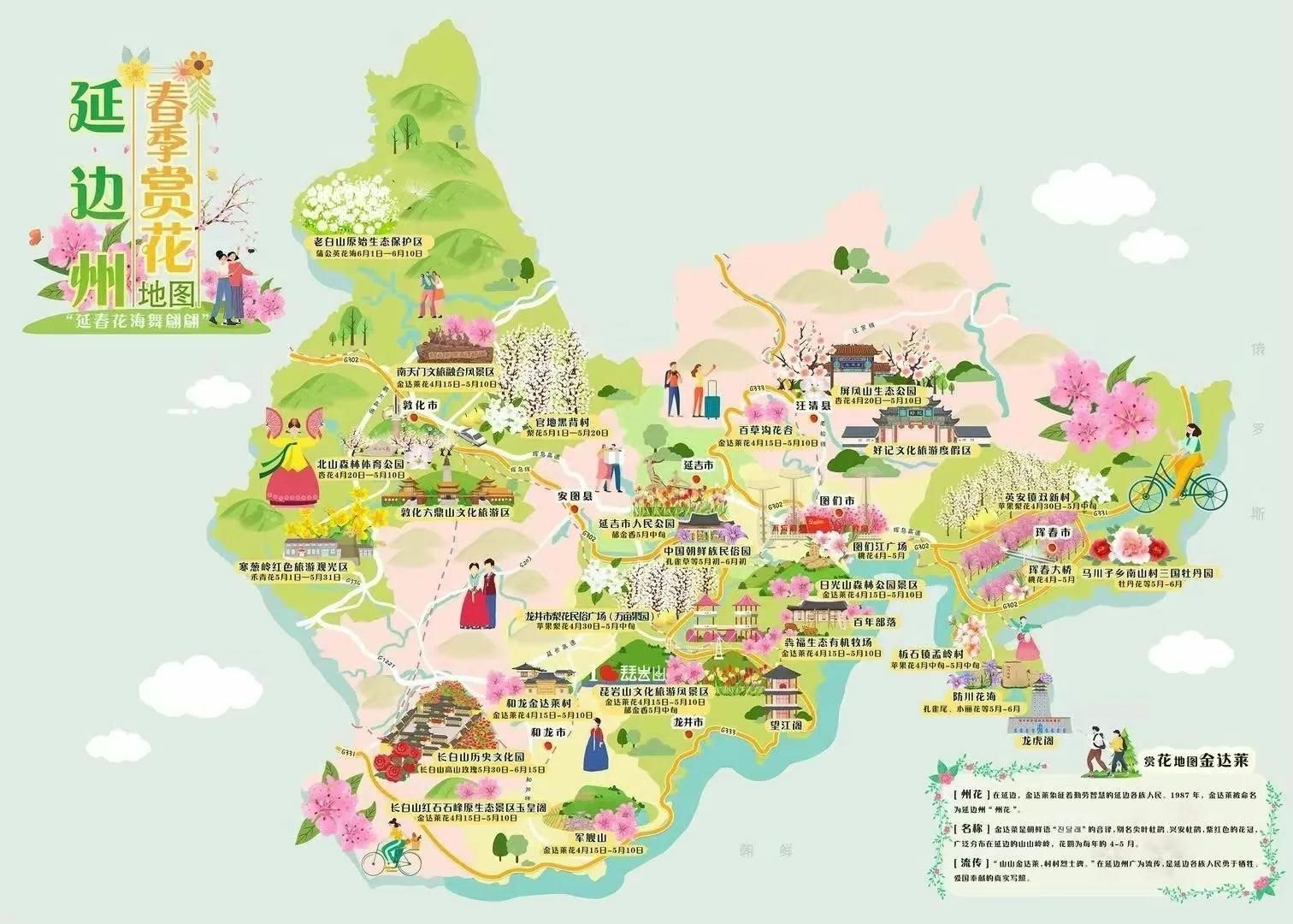 룡정시 동성용진 용성촌 분복생태유기목장, 룡정시 비암산문화관광풍경구, 화룡시 서성진 진달래촌, 화룡시 군함산풍경구, 도문시 일광산삼림공원풍경구, 도문시 백년부락, 왕청현 배초구화곡, 돈화시 관지진 남천문촌, 돈화시 사하연진 사하교령저촌, 안도현 장백산홍석봉원생태풍경구 등지