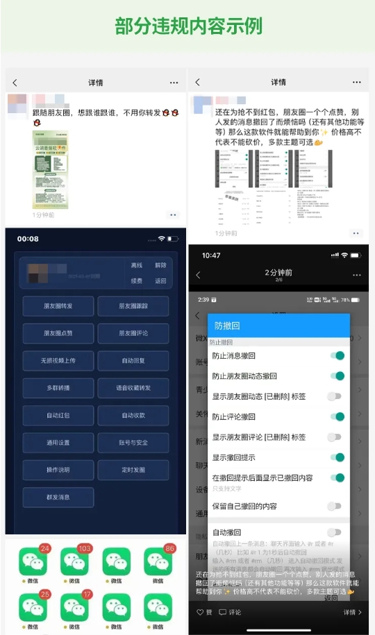 ● 위챗그룹통제: 가상 위치 지정, 대량 인사 등을 통해 대량 친구 추가, 자동화 대량 모멘트 보내기, 원클릭 좋아요 누르기, 원클릭 리뷰 등 기능을 실현한다.