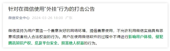 26일 위챗보안센터는 <위챗 ‘플러그인(기능확장용 프로그람)’ 사용에 대한 단속 공고>를 발표했다. <공고>는 <위챗 개인계정 사용규범>에 따라 위챗의 각종 플러그인(外挂) 사용을 금지한다고 명확히 밝혔다. 최근 일부 사용자들이 규정을 위반하고 플러그인 소프트웨어를 사용하거나 모멘트에 플러그인 판매 정보를 게시하는 경우가 있었다. 이와 관련하여 WeChat 보안팀은 특별정돈을 진행했으며 계속해서 정돈강도를 확대하게 된다.