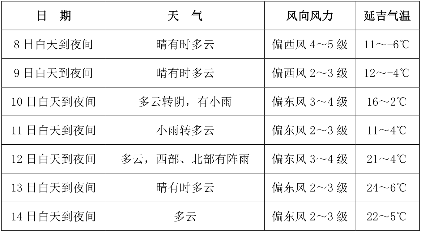 전 주 평균기온은 8.5℃ 안팎으로 평년 동기보다 2.5℃ 가량 높을 것으로 보인다. 이번 주 기온은 전기에 하락되였다가 후반에 상승되겠는데 찬공기 영향으로 8일부터 기온이 전기에 비해 뚜렷이 하락되겠고 9일 아침 최저기온은 일반적으로 -10℃~-5℃겠으며 12일부터 기온이 뚜렷이 상승되겠는데 13일-14일 최고기온은 23℃~25℃에 달할 것으로 예상된다. 전 주 평균강수량은 2~4밀리메터로 평년 동기보다 3밀리메터 가량 적을 것으로 보인다.