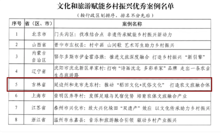 근일 문화및관광부에서는 '문화와 관광으로 향촌진흥에 에너지를 부여한 뛰여난 사례와 우수사례 10건'명단을 공포했는데 화룡시 광동촌이 '논문화+민속문화'로 농업문화관광융합체 건설을 추동한 사례로 우수사례명단에 들었습니다.