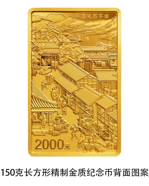 150g 장방형 금기념주화의 뒤면도안은 북송 성도의 전형적인 시정거리와 골목, 상업무역 활동장면 및 지역특색 경관의 조합디자인으로 '중국지페천년'이라는 단어와 액면가가 적혀있다.