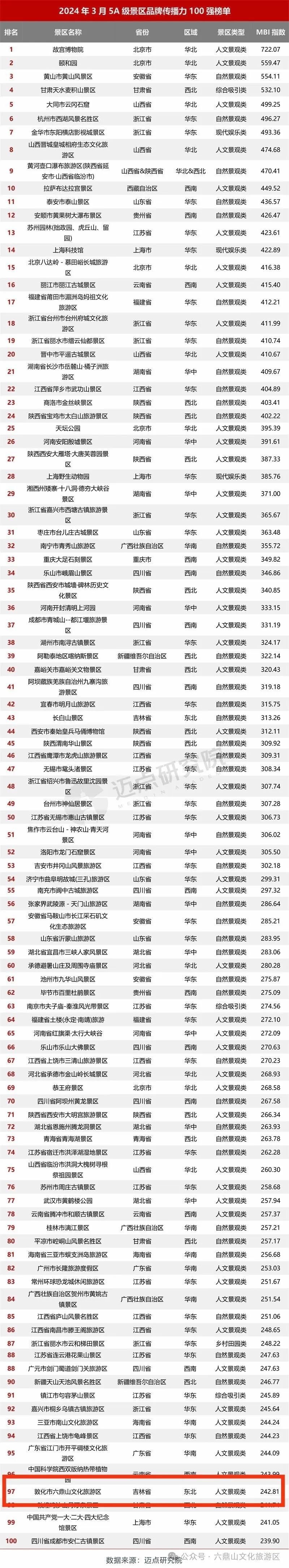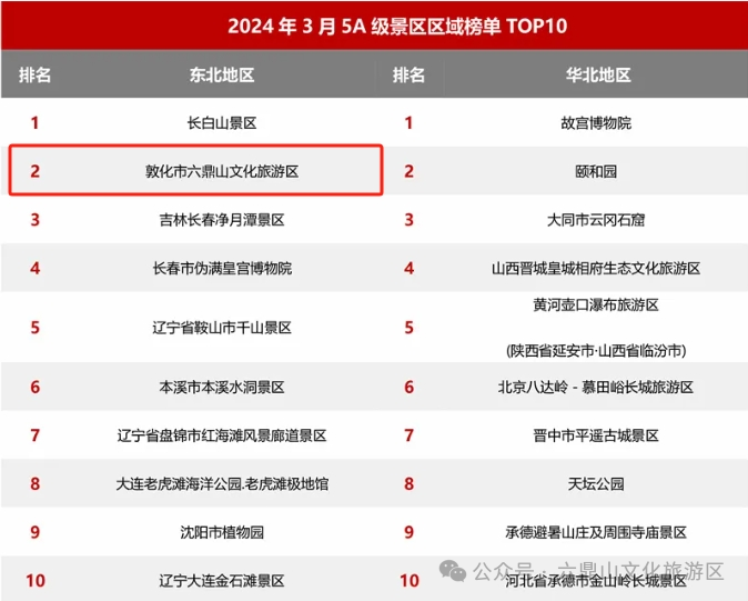일전 매점연구원(迈点研究院)에서 발표한 '2024년 3월 5A급 풍경구 브랜드 전파력 100강 명단'에 돈화륙정산문화관광구가 이름을 올린 가운데 전국 97위, 동북지역 2위를 차지했다.