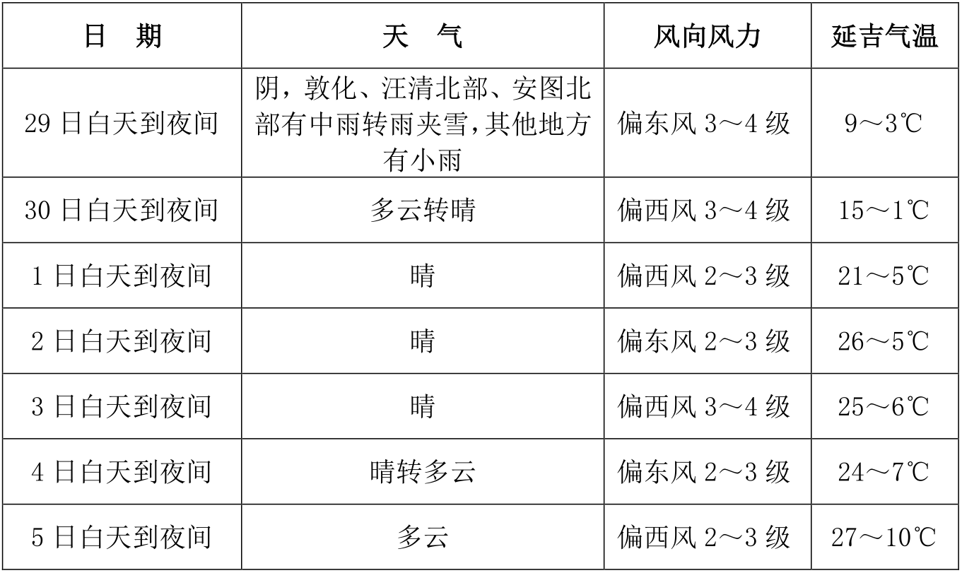 이번 주 평균기온은 11.7℃ 안팎으로 평년동기보다 0.8℃ 가량 높겠고 기온 기복은 비교적 클 것으로 예상되는 가운데 4월 29일-30일 기온은 비교적 낮고 5월 1일 아침 우리 주 대부분 지역에 서리가 내리다가 낮부터 기온이 뚜렷이 상승될 것으로 보인다. 전 주 평균강수량은 6~10밀리메터로 평년동기보다 4밀리메터 가량 적을 것으로 예상된다. 29일 낮부터 밤까지 돈화, 왕청 북부, 안도 북부에는 중등 정도의 비가 내리겠고 밤에는 부분적 지역에 진눈까비가 내리겠으며 기타 지역에는 적은 비가 내릴 것으로 예상된다.