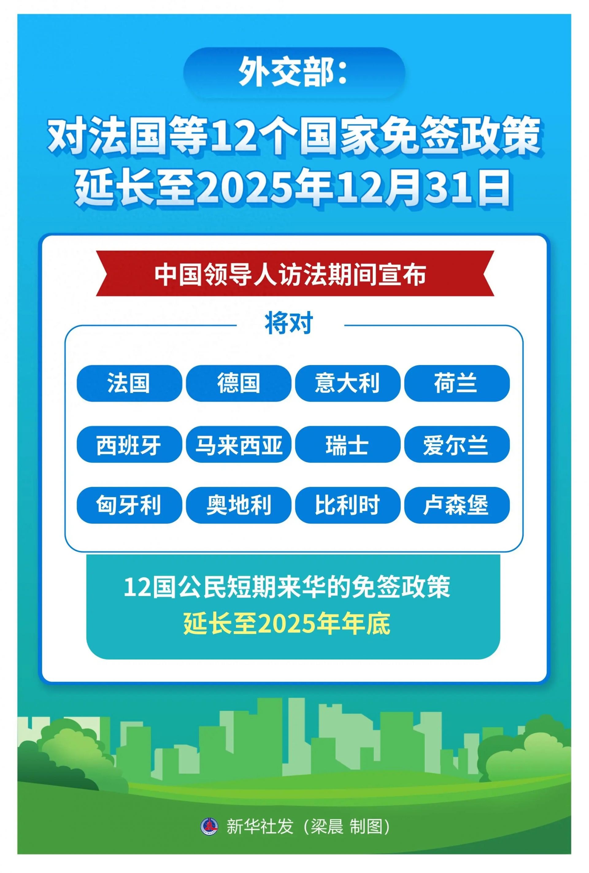 중국과 외국간의 인적 교류를 더욱 촉진하기 위해 중국은 프랑스, 독일, 이딸리아, 네덜란드, 에스빠냐, 말레이시아, 스위스, 아일랜드, 헝가리아, 오스트리아, 벨기에 및 룩셈부르크 12개국에 대한 비자면제정책을 2025년 12월 31일까지 연장하기로 결정했다.