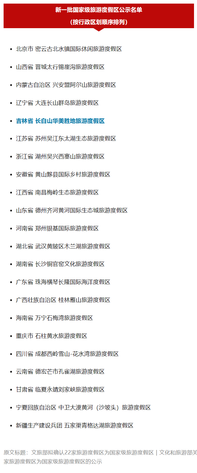 5월 19일 문화및관광부에서 공시를 발부하여 22개 관광리조트를 국가급 관광리조트로 결정할 예정인데 그중 길림성 이곳이 명단에 올랐다.