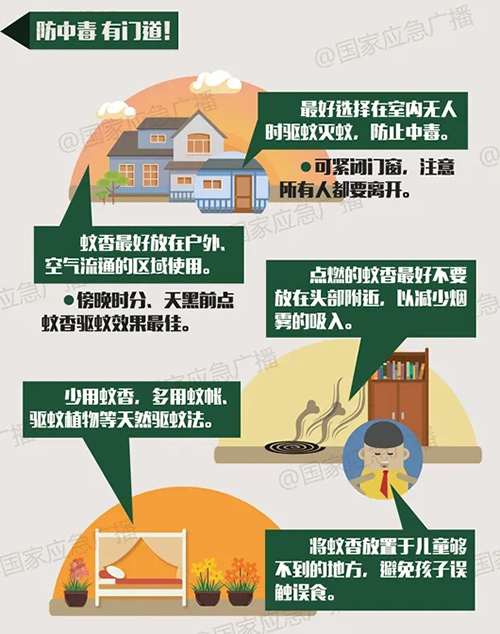 집에 아이, 로인, 임산부 등 민감군체가 있다면 모기장 및 물리적 방법을 사용해 모기를 퇴지할 것을 건의한다. 만약 반드시 모기향을 써야 한다면 될수록 통풍이 잘 되는 곳에 두고 장시간 사용하지 않도록 해야 한다.