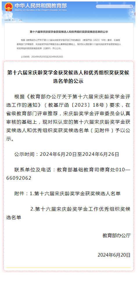 6월 20일, 교육부는 제16회 송경령장학금 수상 후보자와 우수조직상 수상 후보자 명단 공시를 발부했다. 전국적으로 총 1,542명의 학생이 입선되였고 길림성에서는 36명, 우리 주에서는 3명이 입선되였다.
