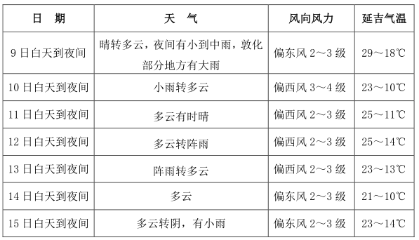 1. 9일 밤부터 10일 낮 사이에 적은 비 내지 중등 정도의 비가 내리겠고 돈화 부분적 지역에 큰비가 내리겠다.
