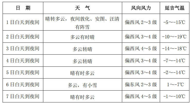 주기상국에 따르면 이번 주 우리 주의 총체적 날씨추세는 평년 동기보다 기온이 낮고 강수가 뚜렷이 적을 전망이다. 전 주 평균 기온은 -10℃ 안팎으로 평년 동기보다 1.3℃ 정도 낮을 예정이다. 이번 주 기온은 낮다가 높아지겠으며 4일까지 기온이 비교적 낮을 것으로 보인다. 3일 아침 최저 기온은 -22℃ 내지 -18℃겠고, 낮 최고 기온은 -17℃ 내지 -13℃겠으며 5일부터 기온이 오를 전망이다. 전 주 평균 강수량은 1미리메터 내지 2미리메터로 평년 동기보다 1미리메터 정도 적을 예정이다. 1일 밤, 돈화, 안도, 왕청에 눈이 내리겠고 6일에 적은 눈이 내릴 전망이다. 이번 주에 분포가 불균형한 강설이 있겠고 강수량은 많지 않을 전망이다.
