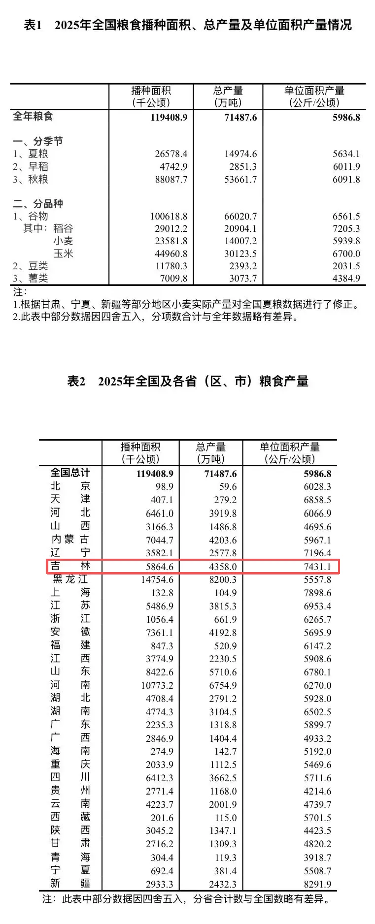 12월 12일 국가통계국은 2025년 알곡산량 수치에 관한 공고를 발표했다. 공고에 따르면 2025년 전국 알곡 총생산량은 1조 4,298억근으로, 2024년보다 168억근 증가해 1.2% 성장했다. 이 가운데 길림성 알곡산량은 871.6억근으로 2024년보다 18.4억근 증가해 2.16% 성장했으며 계속해서 전국 4위를 차지했다.