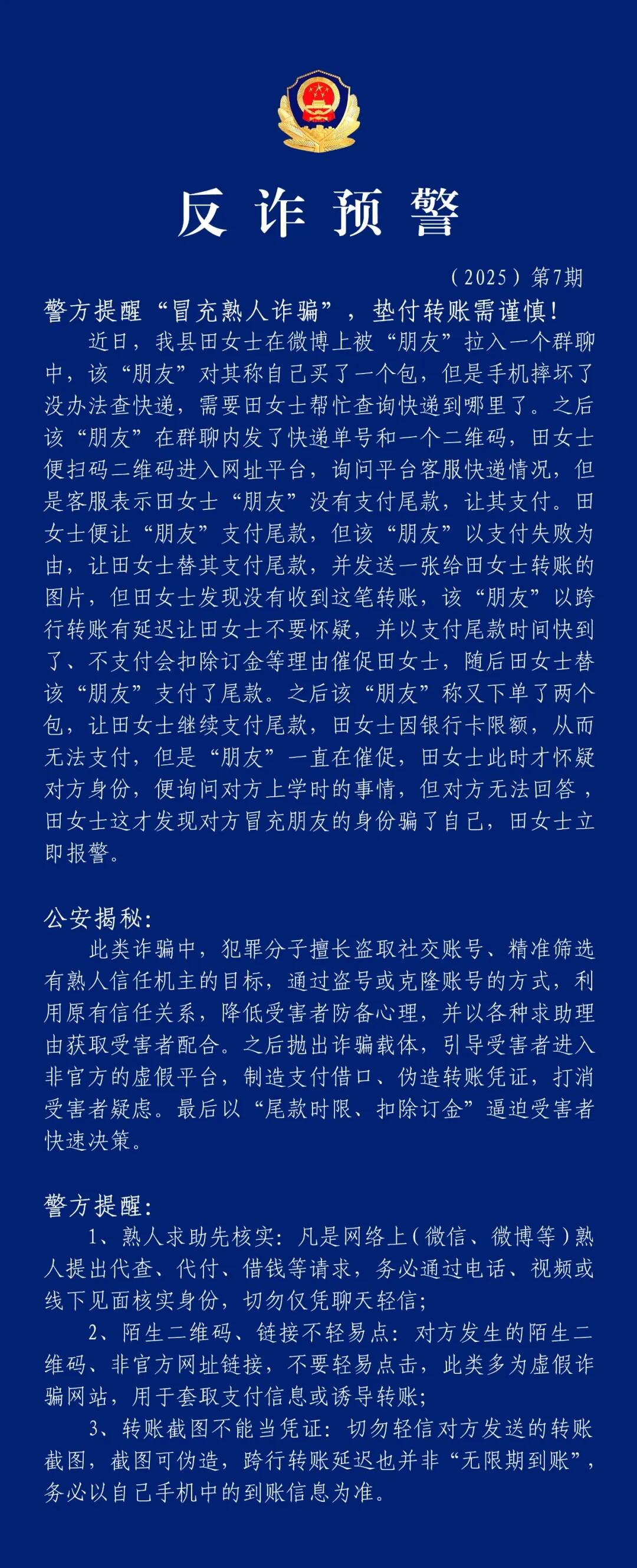 최근 왕청현의 전녀사는 웨이보에서 '친구'가 초대한 단체 채팅방에 들어가게 되였는데, 그 '친구'는 자신이 가방을 구매했는데 휴대폰이 고장나 택배 조회를 할 수 없다며 전녀사에게 택배가 어디까지 왔는지 조회해 달라고 부탁했다. 이후 이 '친구'는 채팅방에 택배번호와 QR 코드를 보냈고 전녀사는 QR 코드를 스캔하여 해당 웹사이트 플랫폼에 접속하여 플랫폼 고객센터에 택배 상황을 문의했다. 고객센터는 전녀사의 '친구'가 잔금(尾款)을 지불하지 않았다고 하면서 전녀사에게 지불을 요청했다. 전녀사는 '친구'에게 잔금을 지불하라고 했지만 그 '친구'는 결제 실패를 리유로 전녀사에게 대신 잔금을 지불해 달라고 부탁하며 전녀사에게 송금한 캡처한 사진을 보냈다. 그러나 전녀사는 해당 금액이 입금되지 않은 것을 확인했고 그러자 그 '친구'는 은행간 이체는 지연이 있을 수 있으니 의심하지 말라고 했다. 그리고는 잔금 지불 기한이 림박했다면서 전녀사를 재촉했고 결국 전녀사는 '친구'를 대신해 잔금을 지불했다. 이후 '친구'는 추가로 가방 두개를 더 주문했다며 전녀사에게 계속해 잔금을 지불해 달라고 요청했고 하지만 전녀사는 은행카드 한도 초과로 더이상 지불할 수 없었는데 그럼에도 그 '친구'는 계속 재촉해왔다. 전녀사는 그제서야 상대방의 신분을 의심하고 학창시절의 일에 대해 물어봤다. 그러나 상대방은 대답하지 못했고 전녀사는 비로소 상대방이 친구의 신분을 사칭해 자신을 속였다는 것을 알게 되였으며 즉시 경찰에 신고했다.