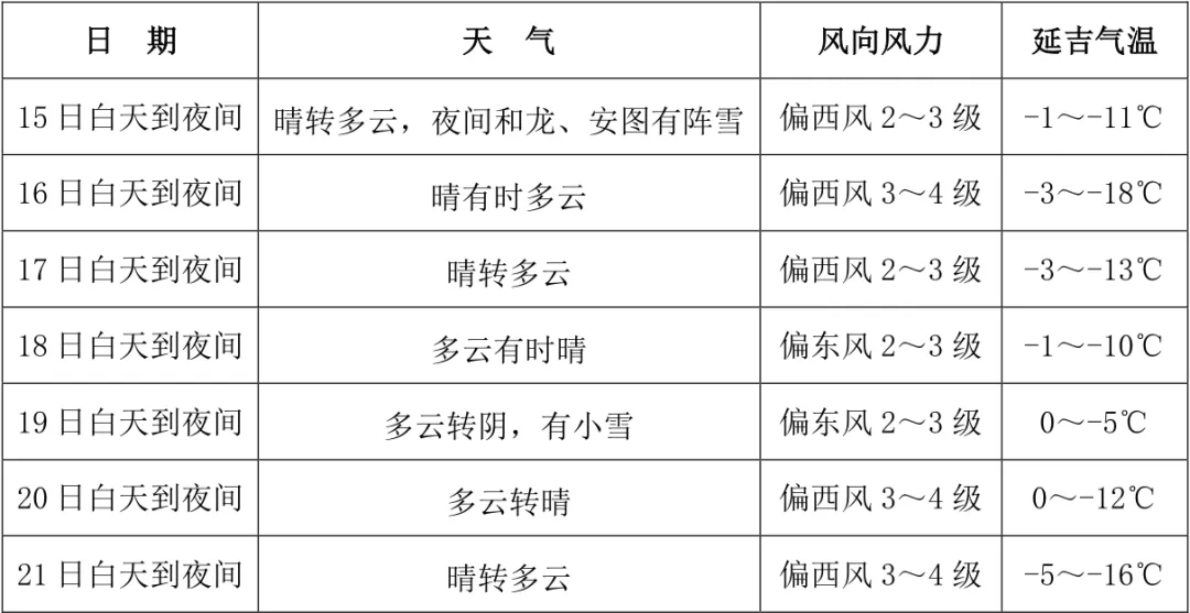 전 주 평균 강수량은 약 1mm로 평년 동기와 비슷할 것으로 예상된다. 15일 밤에 화룡과 안도에 소낙눈이 내리고, 19일에는 적은 눈이 내릴 것으로 보인다.