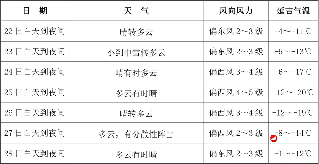 주기상국에 따르면 이번 주 우리 주의 총체적 날씨 추세는 기온이 정상적이고 강수가 다소 많을 것으로 예상된다. 전 주 평균 기온은 -12℃ 안팎으로 평년 동기와 비슷할 것으로 보인다. 25일에 기온이 뚜렷이 내려가겠는데 25일부터 26일 사이 최저기온은 - 24℃에서 -19℃ 사이겠고 낮 최고기온은 -10℃ 이하겠으며 27일부터 기온이 다시 오를 것으로 보인다. 전 주 평균 강수량은 2mm 내지 3mm로 평년 동기보다 1mm 정도 많을 것으로 예상된다.
