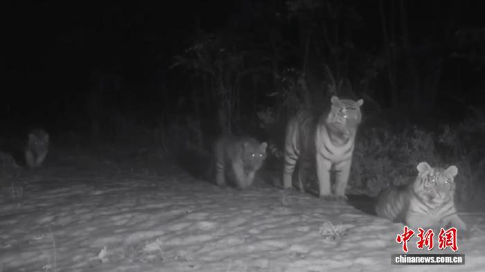 기자가 12월 23일 훈춘시야생동식물보호협회로부터 료해한 데 따르면 최근 동북호랑이표범국가공원 훈춘림구에 설치된 적외선카메라가 한마리의 암컷호랑이가 네마리의 새끼호랑이와 함께 산책하는 희귀한 장면을 기록했다고 한다.