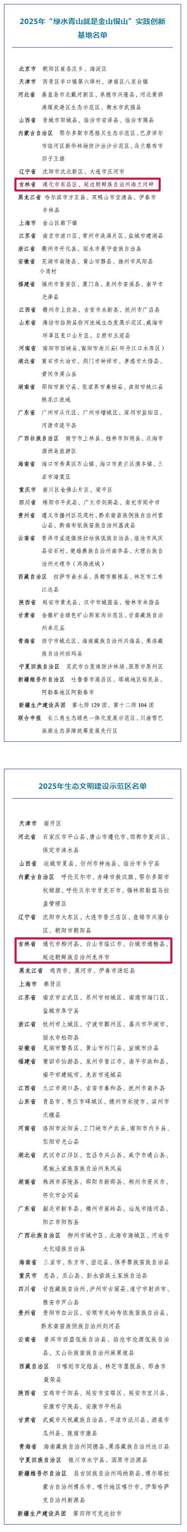12월 25일, 생태환경부는 2025년 '록수청산이 금산은산' 실천혁신기지와 생태문명건설시범구 명단을 발표했다. 그중 길림성 통화시 류하현, 백산시 림강시, 백성시 통유현, 연변조선족자치주 룡정시가 2025년 생태문명건설시범구로 선정되였다. 길림성 통화시 동창구, 연변조선족자치주 해란강반이 2025년 '록수청산이 금산은산' 실천혁신기지로 선정되였다.
