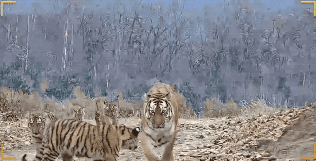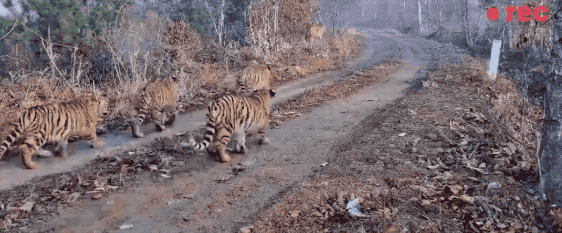최근 동북범표범국가공원 훈춘지역에서 '어미 한마리에 새끼 다섯마리 모두 여섯마리 호랑이가 함께 이동하는' 희귀한 장면이 포착되였다.