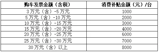 개인소비자(호적 제한 없음)는 활동에 참여한 자동차판매기업에서 차(신에너지차 포함, 영업용 차량 및 중고차 제외)를 구매할 때 알리페이 APP 플랫폼 '코드우대' (码上优惠) 미니프로그램을 통해 신차 소비보조금을 신청할 수 있다(보조금이 조기 소진되면 활동은 조기 종료됨). 소비자는 기업우대정책을 향수한 후 구매금액에 따라 등급별로(모두 5개 등급) 정부보조금을 추가로 지원받을 수 있다.