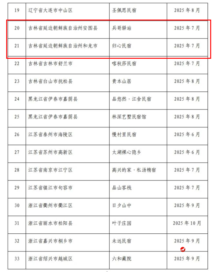 최근 전국관광표준화기술위원회는 2025년 전국 갑급 및 을급 관광민박평가결과를 공시했다. 〈〈관광민박기본요구 및 등급 구분> 시행사업지침>에 근거해 민박사업자의 자발적 신청, 성급 평가기구의 예비심사 및 전국 최종심사를 거쳐 총 185개 관광민박이 국가급 등급기준에 기본적으로 도달한 것으로 최종 인정되였다. 이중 갑급 민박은 81개, 을급 민박은 104개이다. 우리 주 안도현의 '병가역참(兵哥驿站)'과 화룡시의 '귀심민박(归心民宿)'은 각자의 특색과 봉사품질을 인정받아 을급 관광민박 공시목록에 성공적으로 입선되였다.